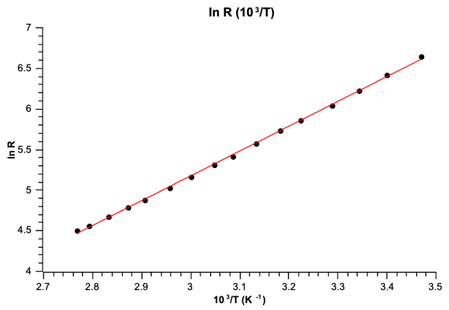 t (°C)R (Ω)T (K)103/T (K-1)ln R